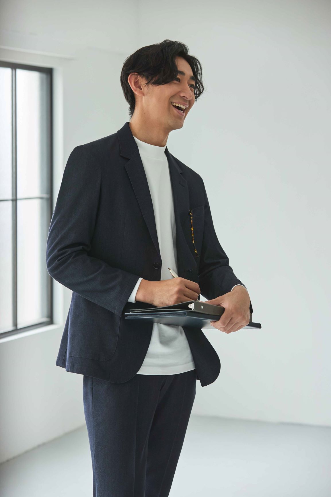 デニム調の素材をカジュアルに仕立てたセットアップスーツは