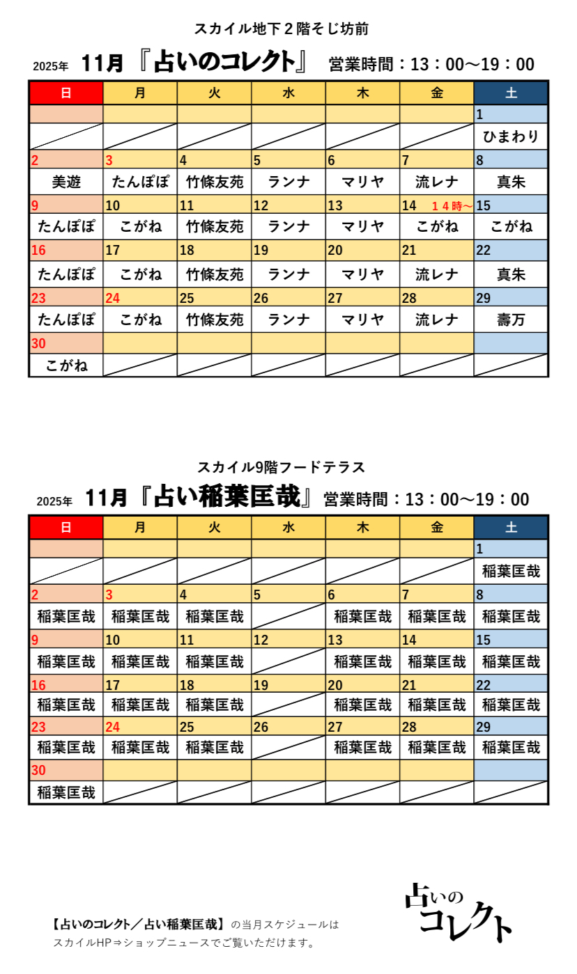 占いのコレクト 11月度占い師スケジュールです。