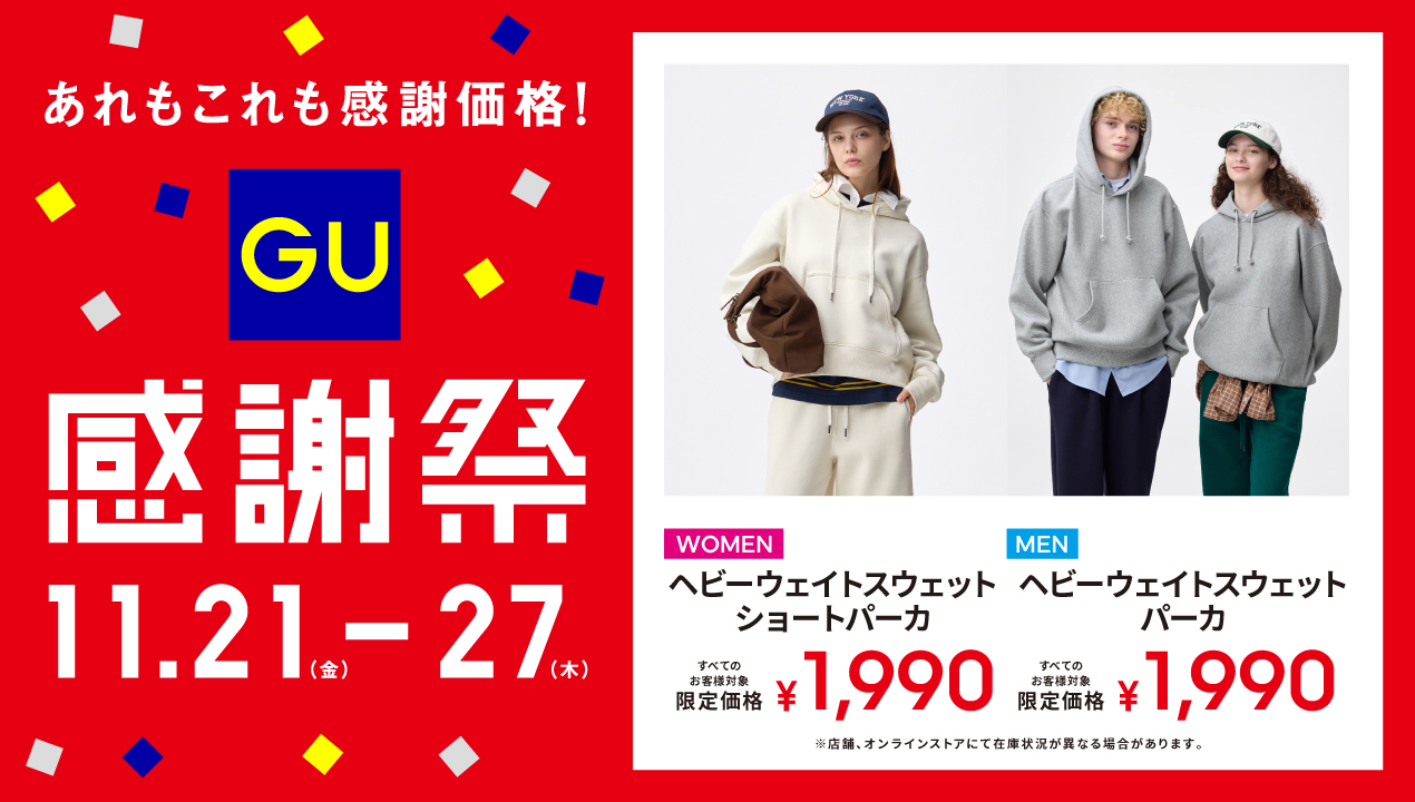 2025.11.21 お得な感謝祭を11/21(金)より開催します! お得な感謝祭を11/21(金)より開催します! ジーユー TEL:052-238-3205 営業時間:10:00~20:00 店舗情報はこちら