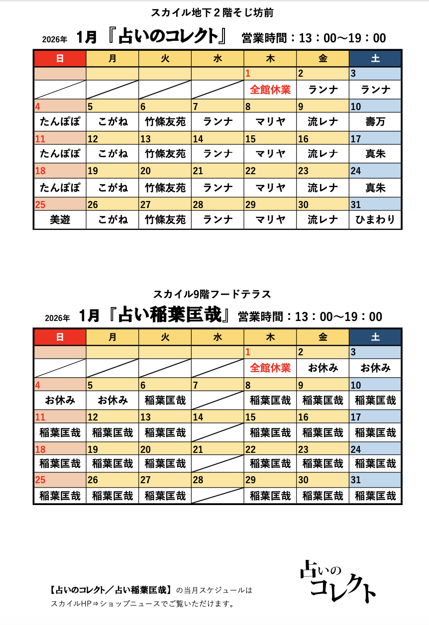 NEW 2025.12.24 占いのコレクト 2026年度 1月度占い師スケジュールです。 占いのコレクト 営業時間:13:00~19:00 鑑定料金:1件 3,000円/総合 5,000円 店舗情報はこちら
